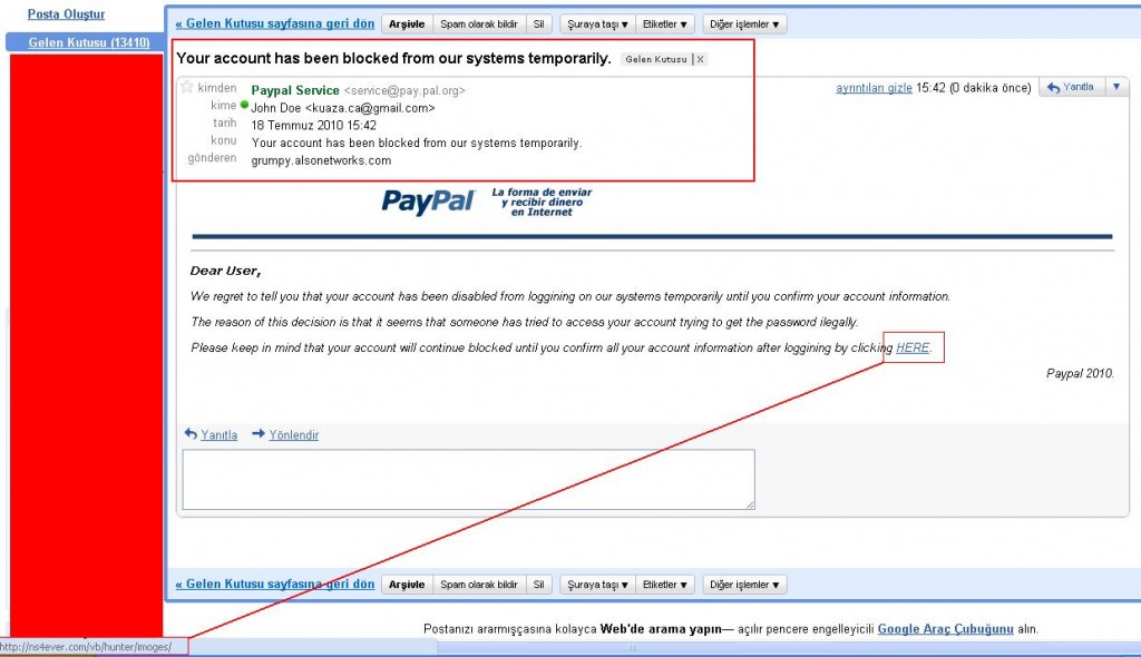 Aşağıda sahte bir PayPay e-maili görülüyor. Dikkat ederseniz adres http://ns4ever.com/vb/hunter/imoges/ gönderene bakarsanız alakasız biri.